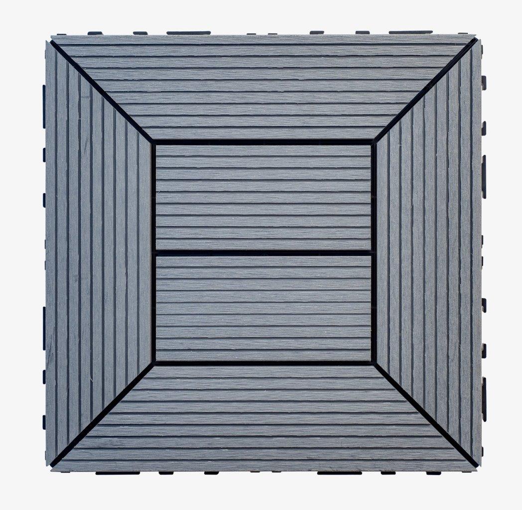 WPC terasová dlaždice, rozměr 300×300 mm, výška včetně polypropylenového roštu 24 mm, barva šedá.